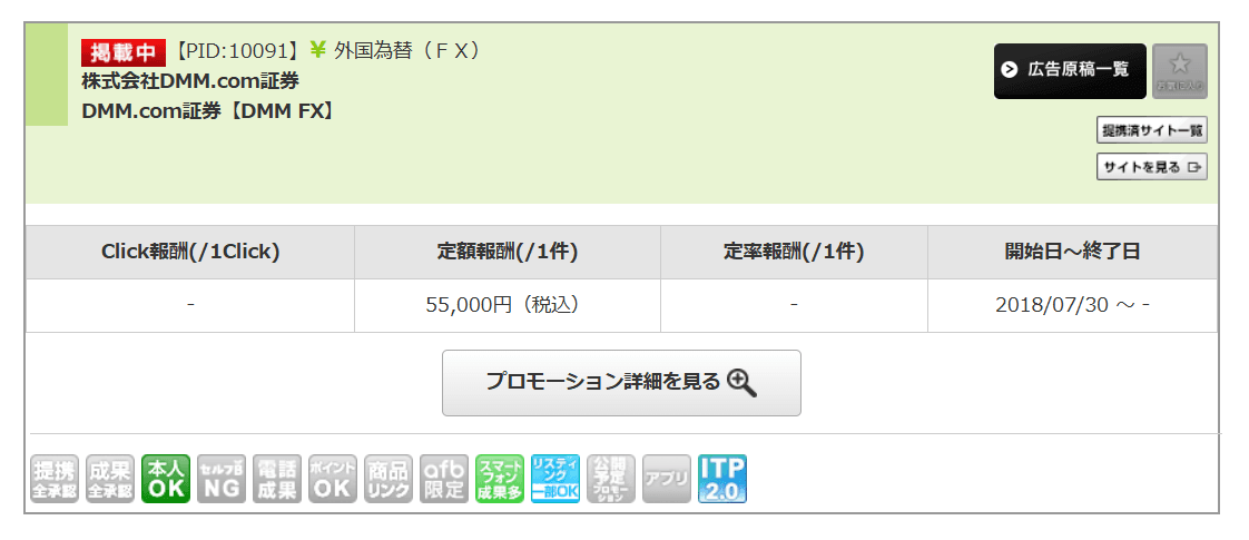 登録が完了したら、afbのトップページにある検索窓で「DMM FX」と入力してね。 すると通常の広告案件として出てくるので、ここで「提携申請」をポチるだけ!